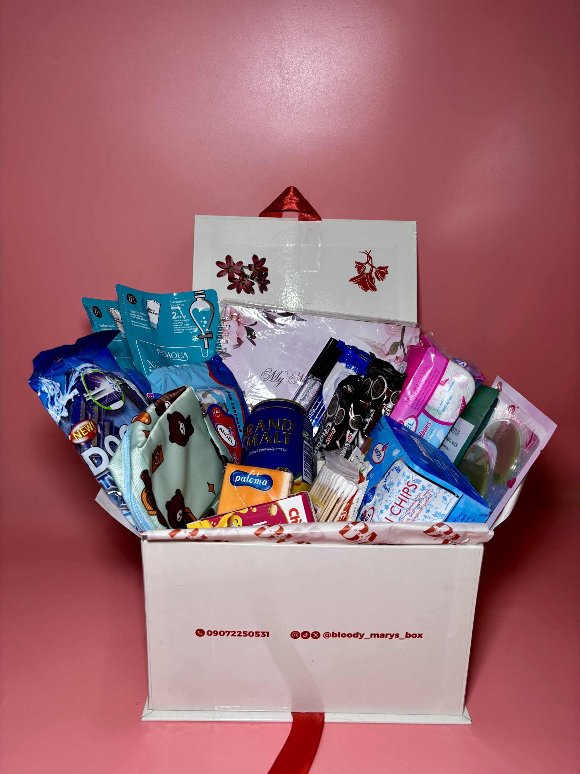 This box contains a pack of Pad, Panty liner, Booty wipes, Calming Tea, Boric Acid pills, Shaving stick, Drink, Snacks, Note pad, Pen, Pocket tissue, Lip Gloss, Face sheet mask, Eye mask, Cotton buds, Pimple patch and Period pouch, Disposable period panties