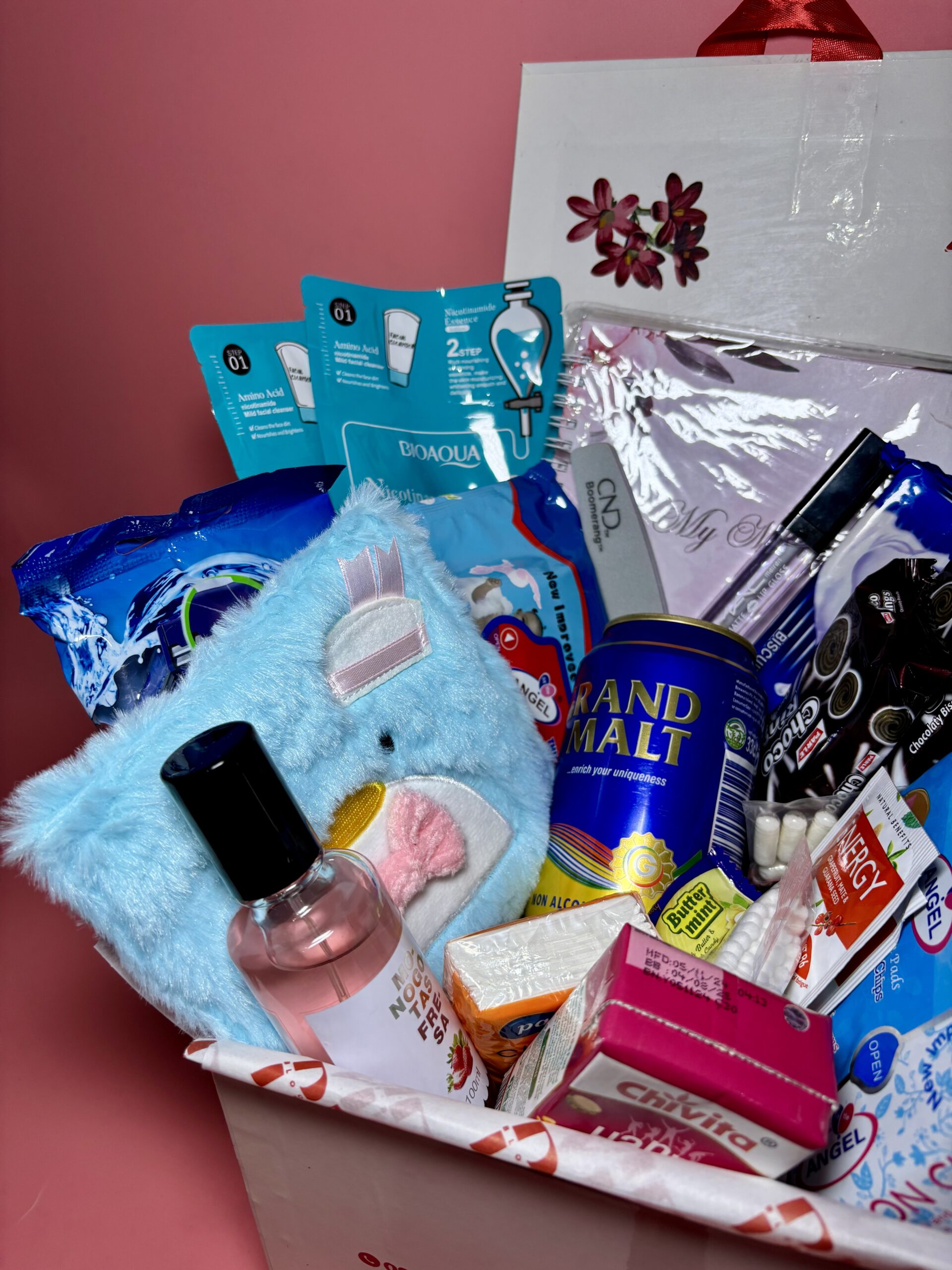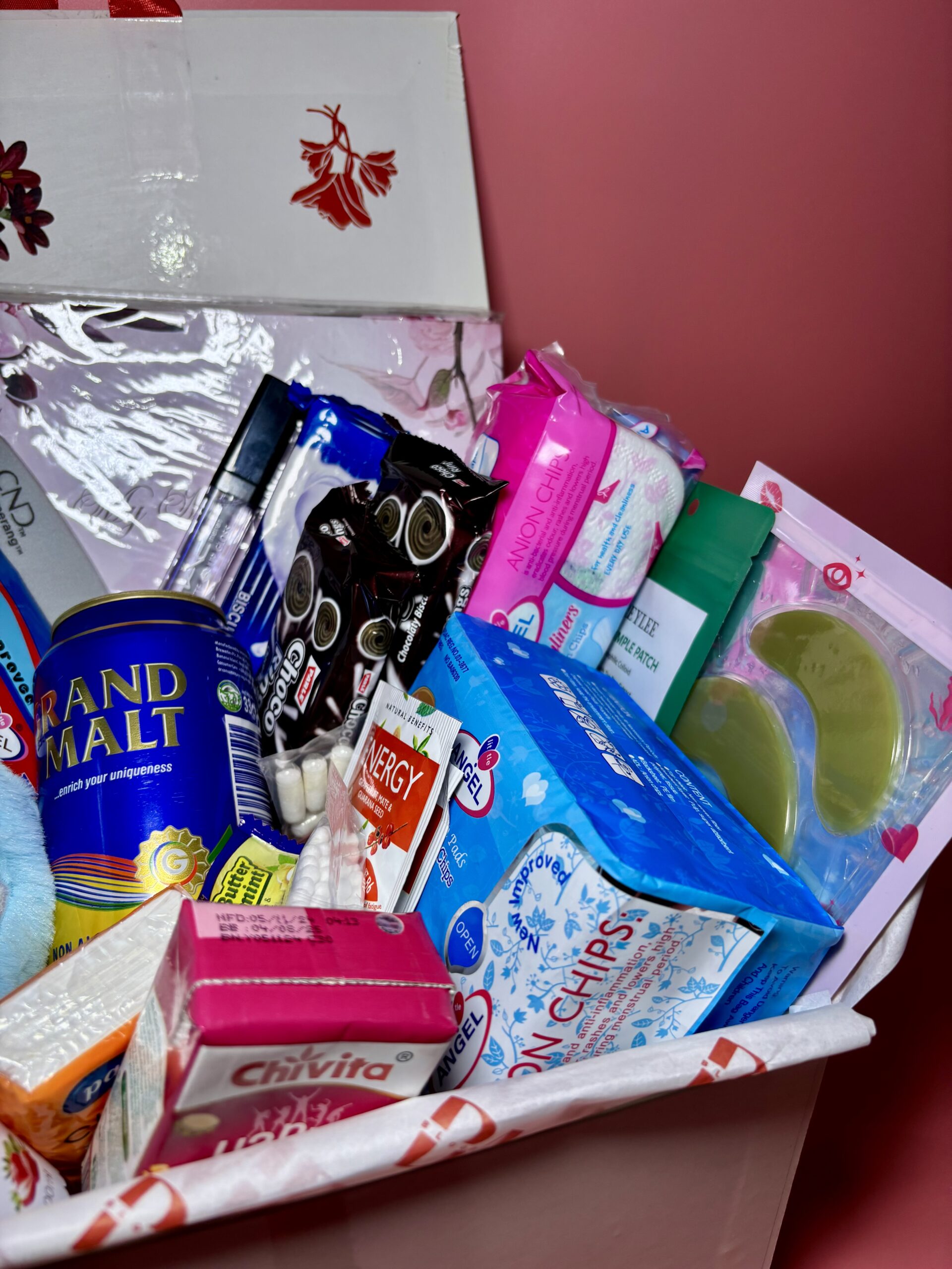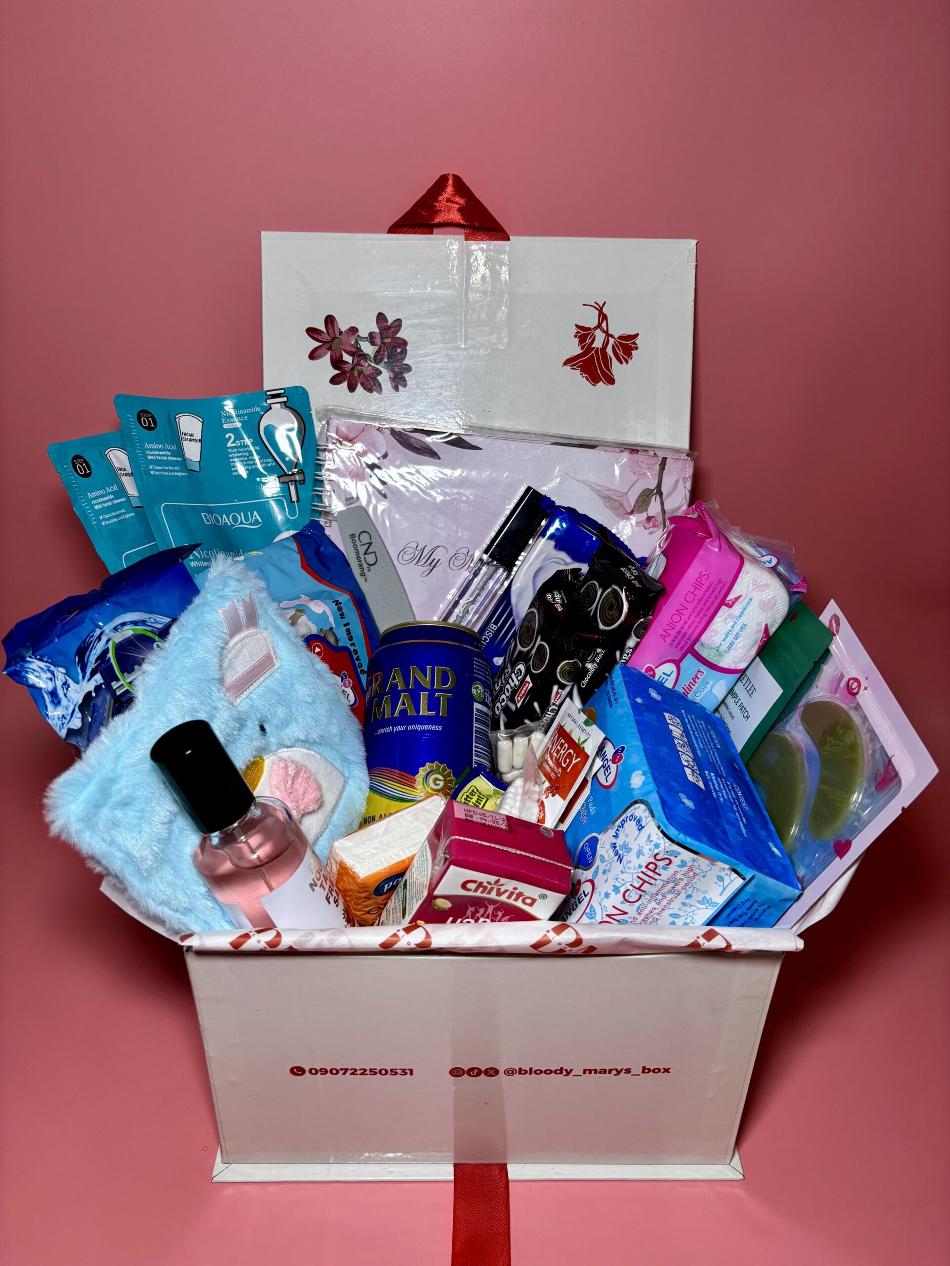 This box contains a pack of Pad, Panty liner, Booty wipes, Calming Tea, Boric Acid pills, Shaving stick, Drink, Snacks, Note pad, Pen, Pocket tissue, Lip Gloss, Face sheet mask, Eye mask, Cotton bud, Lip mask, Period pouch, Body mist, Nail buffer/Cramp Relief Heat Patch, Pimple patch, Heat Pouch, Disposable period panties
