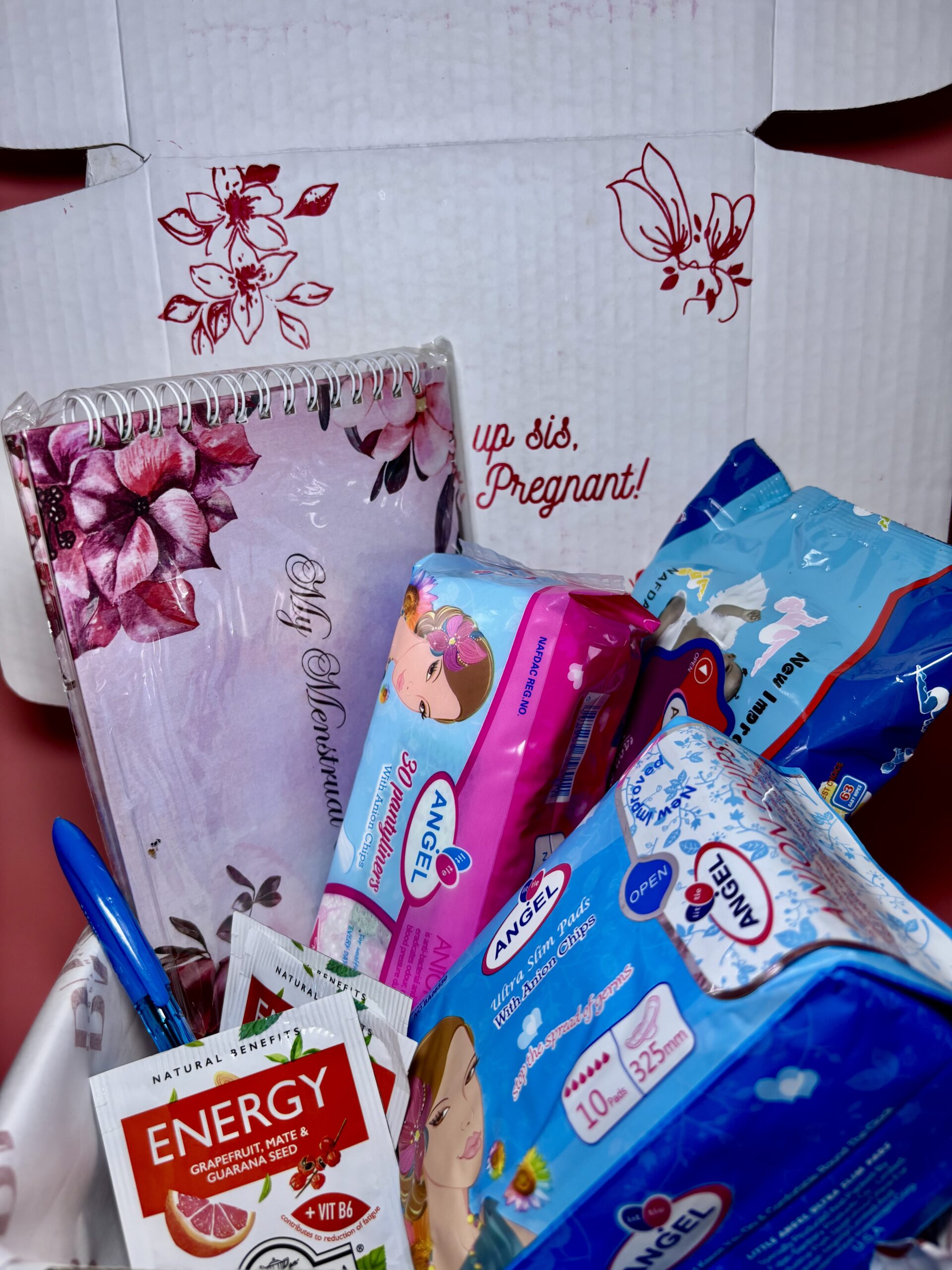 This box contains a pack of Pads, Panty liner, Booty wipes, Calming Tea, Note Pad, Pen, Disposable period panties